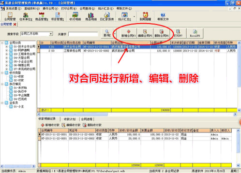 在软件主窗体中点击[新增合同]按钮或按F3,在弹出的窗体中输入相关信息资料,然后点击[新增]按钮就可以保存合同资料;在主窗体中点击[编辑合同]按钮或按F5即可对已有合同进行修改,在主窗体中点击[删除合同]按钮或按F6可删除过时无用的合同及其收付款记录。界面如下图: