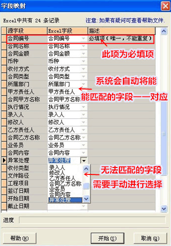 Excel字段名即是Excel表中的字段,您把“源字段名”和“Excel字段名”一一对应好,这样程序才能把信息导入到相应的数据库字段中,比如上图中的单位名称对应单位名称。系统会将Excel字段与源字段进行匹配,如遇少数无法匹配的字段需要手动进行字段选择,单击选中字段便会弹出下拉选择框,再选择字段。