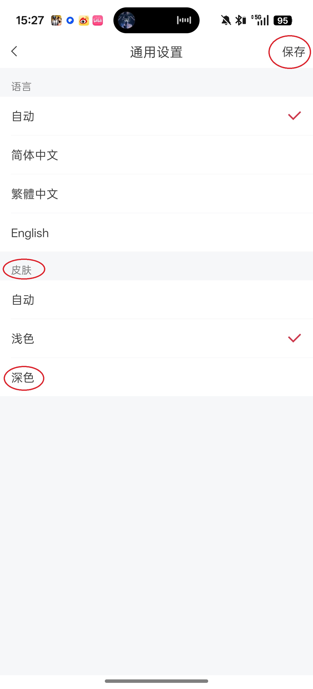 4、点击“皮肤”板块的“深色”,随后点击屏幕右上角的“保存”。