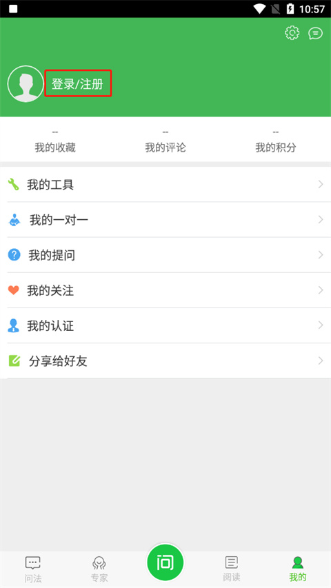 1、双击打开掌上问法软件,点击我的,再点击登录/注册;