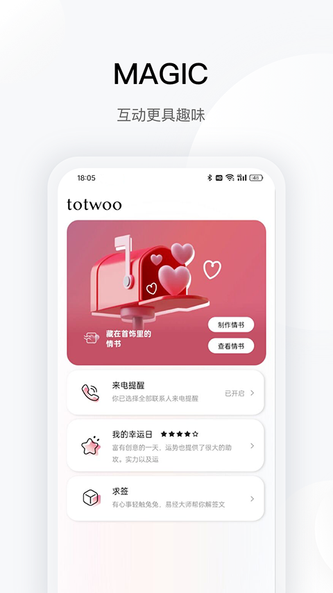 1、心有灵犀互动 敲击智能珠宝触发互动效果,让情侣之间可以通过光与振动进行浪漫的交流。 2、来电提醒定制 用户可以设置不同的闪光和振频,即使手机静音也能及时收到来电提醒,保持与重要人士的联系。 3、运动健康监测 智能珠宝能够自动记录步数与卡路里消耗,定时提醒用户活动状态,促进健康生活方式。 4、生活指引功能 除了星座运势解读外,应用还提供首饰求签功能,用户可以在生活迷茫时寻求易经大师的指引。totwoo感应手链App使用设置教程