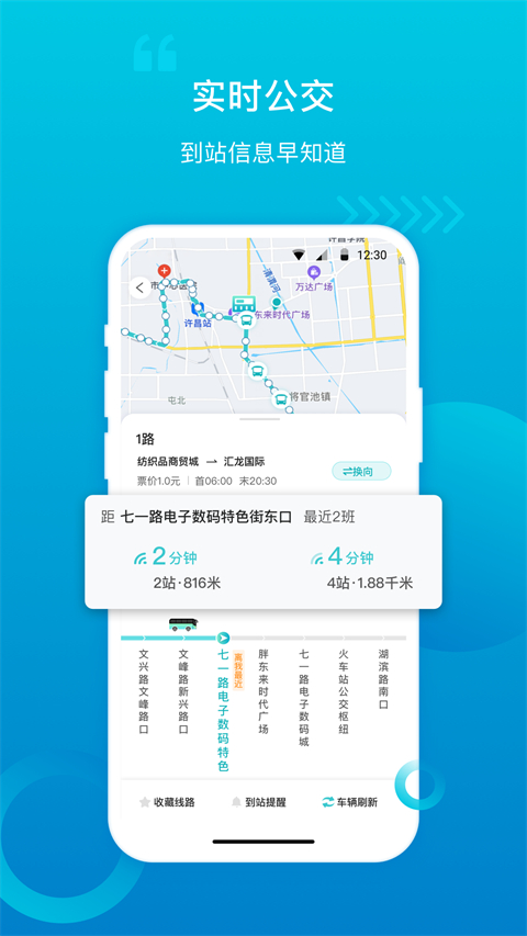 1、换乘提示 提供某两地之间所有公交线路、换乘信息。 2、下车提醒 用户可根据需要自行设定下车提醒,避免坐过站。 3、充值网点地理信息 提供许昌辖区内所有IC卡充值网点具体位置。 4、公交闹铃 设置需要乘车的站点,公交车经过该站点时,客户端会发起乘车闹铃,提醒乘客及时乘车。 5、实时候车 可查询最近三班公交车离所在站点还有几站以及距离的实时数据,方便乘客候车。更新日志