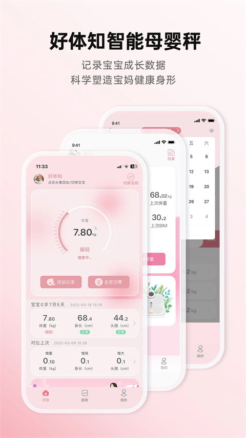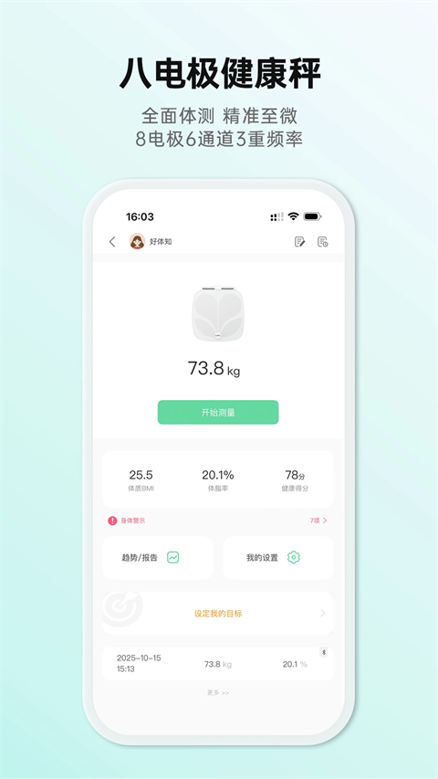 1、【实时评测】详细分析身体成分,健康数据实时掌控。 2、【运动饮食】运动饮食科学管理,让你瘦身有依据。 3、【健康趋势】坚持每天评测,健康趋势一目了然。 4、【成员管理】监测管理您身边每个家人的身体健康状况。 5、【目标设定】科学规划减肥目标,为你的健康负责。 6、【配合硬件使用】bodivis,好体知 智能成分秤。软件优势