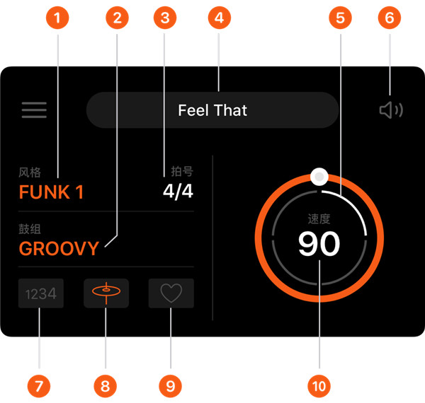 10、速度调节: 通过速度转盘调整歌曲速度 (BPM),在转盘区域内连续轻点可快速设置速度(打拍定速)