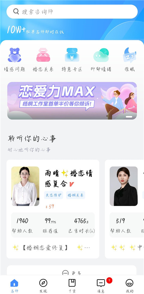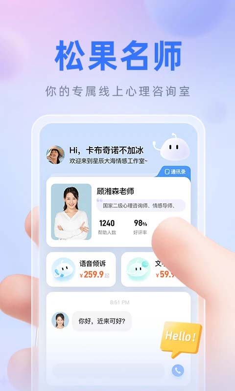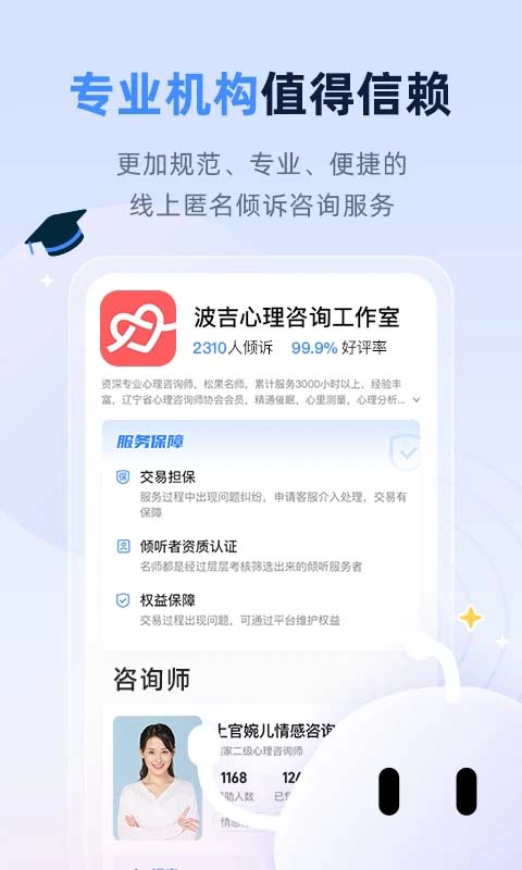 1、私密沟通 私域化的社群打造,数位名师服务为你服务,让您获得优质的服务和高效的沟通。 2、隐私安全 一对一私人专属咨询,文字、语音安全加密,平台提供权威协议,保护咨访双方权益。 3、平台保障 倾听者经过平台严格的审核认证,服务质量有保障。 4、专业服务 通过松果倾诉平台精选倾听者,服务更加专业,体验更加优质,减少倾诉者的筛选及试错成本,助力倾诉者更快找到合适的倾听者。 5、实时高效 7*24小时真人在线,随时随地想问就问。更新日志