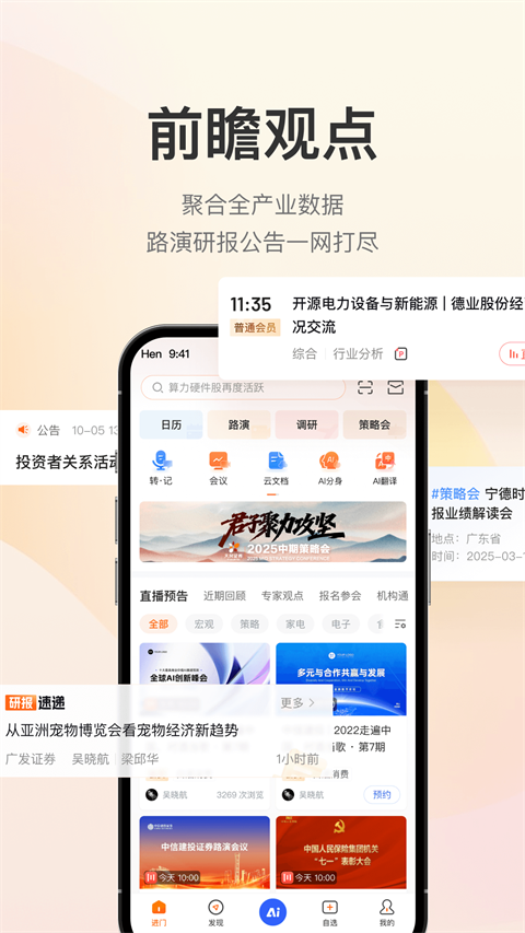 路演会议系统:网络音视频+电话路演会议,高效便捷会议管理平台 自助会议系统:与腾讯会议互联互通,白名单校验,小范围交流便捷合规 分析师路演:3000+分析师路演,年度策略,高端闭门等路演会议 上市公司路演:业绩发布会,重大事项路演,定增路演等实时发布 上市公司调研:资源丰富,私密交流,调研需求线上线下高效对接 行业专家:深度产业解读、投资大咖线上分享,精准把握产业动向 专栏课程:研究专栏紧跟热点,行业深度投研培训,犀利洞察投资趋势路演会议系统介绍