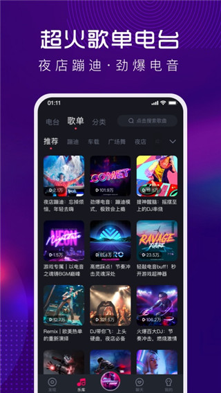 提供搜索热词榜 超劲爆电音嗨曲、语录口白、经典老歌、个性铃声,快来看看大家都在搜什么吧 本地歌曲智能管理 本地歌曲扫描、收藏管理、缓存管理,人性化一点即听,让你随时随地都能嗨起来 最新歌曲 拥有最新的最流行的DJ舞曲 丰富精彩的DJ分类 包涵20个以上的DJ分类,中文、英文、社会摇、喊麦、精确明晰,包罗万千 活跃的听友圈子 这不但是一个DJ音乐分享的社区,各位听友分享各自的珍藏软件功能
