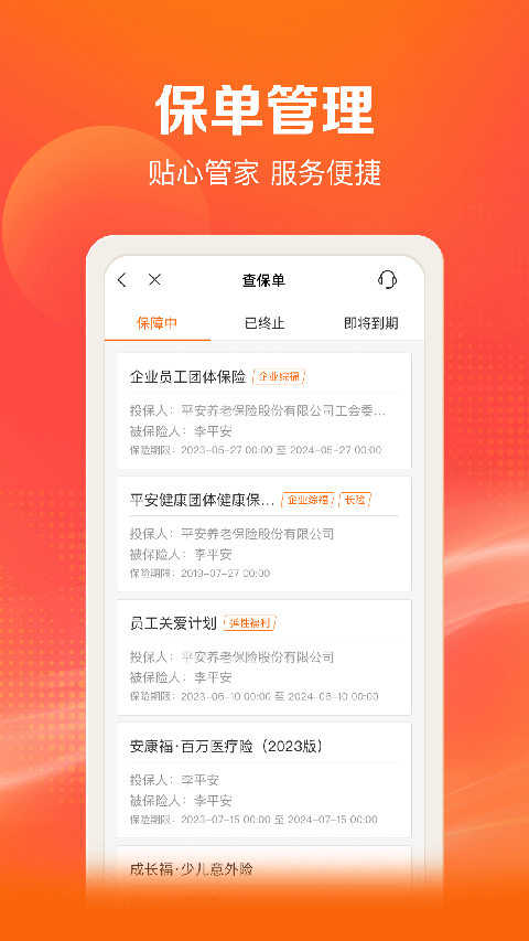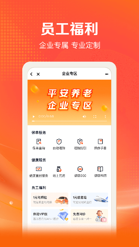 1.保险: •查保单:全面查阅保障情况,涵盖企业团体保单和个人家庭保单; •办理赔:自助理赔,秒级到账,进度透明,实时查阅。 2.健康: •药械商城:正品保价,支持健康直付服务; •线上医院:可开处方药,送药上门,符合保障约定客户支持直付/代理赔/自付; •企业员康:提供多种企业健管服务套餐,健康360、家庭医生、安享无忧; •健康体检:团检、家人体检均可线上预约,在线查看报告,免费报告解读。 3.养老: •企业年金:支持企业年金账户三查,查余额、查缴费、查详情;支持企业年金受托服务全流程线上化,包括新人参与年金计划、调整投资比例、退休领取申请; •个人养老保险:涵盖分红型、万能型、专属商业养老保险等年金保险产品; •养老服务:链接居家养老、社区养老、机构养老等供应商,提供居家照护、失能护理、康复训练等养老服务。 4.活动: •注册用户享受免费问诊服务;更新日志