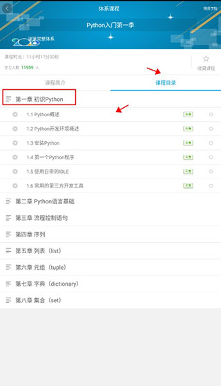4、来到课程目录,点击文字可以查看章节内容,点击可以进入视频。