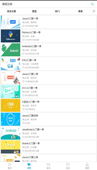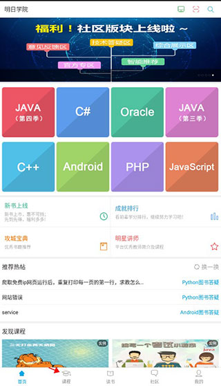 1、读书 读书是明日科技新上线的模块,也是明日科技多年编程项目、编程经验的积累,适应各种用户学习,更有不断更新的电子书资源将陆续上线。 2、视频课程 视频课程涵盖明日科技的所有课程,针对不同用户的学习需求,用户可以根据自身情况选择适合自己的学习方式。视频课程包括体系课程、实战课程等,体系课程可以让用户的学习更具有系统性,同时能根据课程的周期,更有效的提高学习效率,优化学习效果。实战课程可以让用户通过实例、项目、模块等实训来练习,让学习更有效。 3、社区 社区是明日科技用户交流的重要部分,可以进行技术讨论、下载相关资源以及灌水交流等。互动交流时,可以上传图片、附件、投票支持或投票反对,更可以@好友一起玩耍。明日学院app怎么看课程