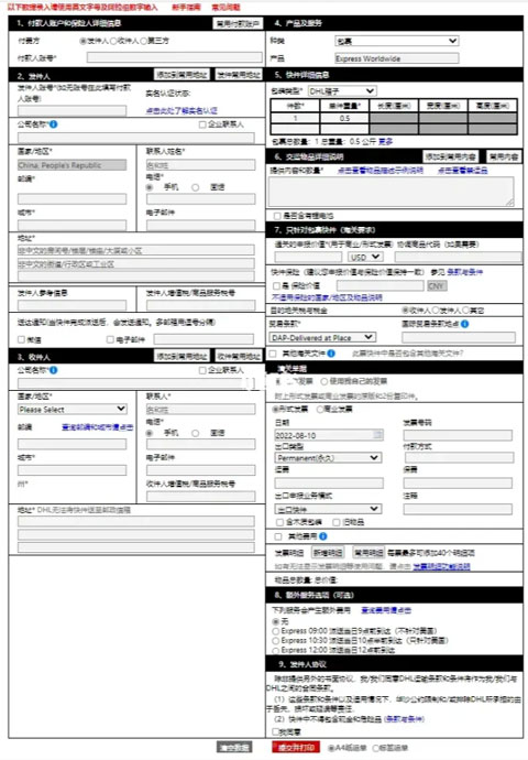 1、首先进入EShip网站,注册账号登录。 2、然后点击“寄件”,填写DHL运单。 若是寄件方支付费用,则在最上端填上寄件方的预付账号; 若是收件方支付费用,则写上收件方的到付账号。 3、接下来要开始填写寄收双方的相关资料了,这点比较简单,按客户提供的地址填写就好。 【寄件人资料】 A、寄件人姓名 B、寄件人地址/公司名 C、寄件方邮政编码 D、寄件人电话号码 【收件人资料】 A、收件人公司名称 B、收件人地址 C、邮政编码/国家 D、联系人/电话/手机号码 【交运快件资料】 快件资料中必填项是: A、包裹类型(文件/包裹)(DHL箱子/自己的包装/花袋信封) B、总件数和单件重量(注:若件数较多,则需将总重量平摊到各件中,小数点保留一位,箱单发票上要注意算好,避免重复操作。) C、交运物品详细说明:需要填写具体的产品名称和数量 D、物品价值(小数点可保留2位,多个产品建议提前算好平摊单价,具体明细可在发票中提现) E、贸易条款,若是预付的,基本上默认DAP。 F、清关单据:若产品种类较多不可归成一类,则需要自己另外做箱单发票;若只有一类,那可以选择“制作发票”,简单申报,点击“新增明细”,输入产品相关信息即可(第一次用完后,以后相似产品可直接选择“常用明细”)。 G、额外服务选项就默认“无” H、最后勾选同意,本页操作就完成了。 4、接下来会跳转到,单号发票打印和预约界面 注:单号和发票都建议下载保存电子版并打印出纸质版,纸质版交给DHL快递员,电子版发客户。 5、随后点击“去预约快递员取件”,会出现预约界面如图4,点击进入出现图5,左侧会自动跳出前面填写过的寄收件人账号信息,只要填写下后侧的联系人、电话、取件地一般选Reception,然后日期时间选择下即可。 6、货值小的产品直接清关,只要返回图4填写快速清关信息进行申报即可;若是货值大的产品,则需要提供完整的报关资料(随货交给快递员)