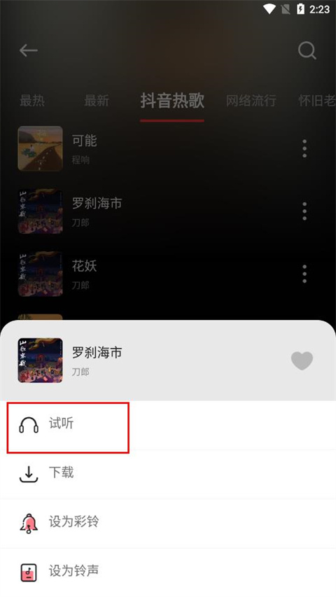 2、任意选择喜欢的歌曲,点击试听即可一键畅听,下载