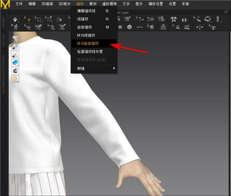 3、选择菜单栏“缝纫——M:N自由缝纫”,或点击工具栏“线缝纫”下边的下拉三角,找到“M:N自由缝纫”