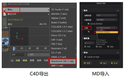 2、接下来,我们在C4D中选择导出,找到OBJ格式,进行默认导出。打开MD软件,点击左上角导入OBJ,单位建议选择为CM