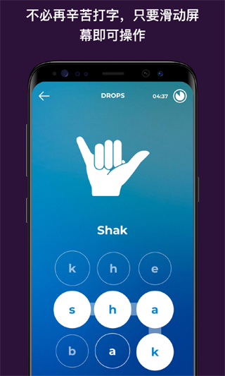 1、语言学习,从未如此轻松 我们希望不仅能够创造出一款游戏化的学习应用,更创造出一种有益的游戏体验。寓学于乐的同时,希望你能够通过游戏的碎片时间为学习新语言积累可观的知识财富。 2、基于滑屏互动的学习 向真正快捷的滑屏互动和点触say hello吧!上滑下滑左滑右滑,你将能从你的“五分钟海绵”中挤出更多的词汇点滴。 3、专注于词汇,而不是语法 对于外语初学者来说,“是什么”也许比“怎样做”更重要。我们精心选取了超过1000个实用的词语,这些都将是你在不同场景下使用这门新语言时用得到的。专注,并且做到极致的优秀。 4、习惯养成 希望能够将你变成沉迷于学习的人。不管你的学习工具是多么的有效,如果不能每天坚持,一切都是徒劳。学习外语也许并无捷径,但只要你能坚持每天使用Drops,就会看到“水滴石穿”的奇迹!Drops好用吗