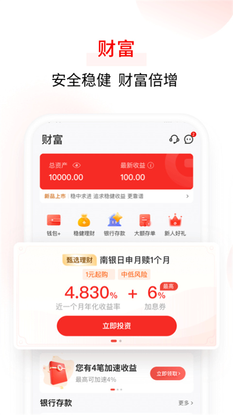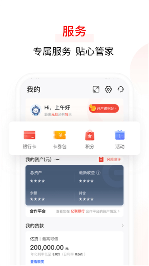 1、安全保障:持牌经营,安全保障。 2、在线开户:不出门,轻松体验刷脸开户,从此金融服务随叫随到。 3、精选理财:无面签,低门槛,精选明星理财子产品,一站式满足理财需要。 4、存款+: 存款保险保驾护航,存款期限丰富,稳定可靠,给自己加点“薪”。 5、亿贷: 额度20万(以审批为准),年化利率低至8.00%,快速审批,按日计息,随借随还。软件优势