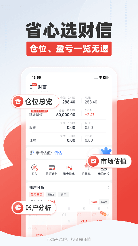 1、全市场行情 达,则兼济天下; 2、行情、账户预警 及时规避资金风险; 3、账户分析 盈亏操作一目了然; 4、金融商城 有效合理配置资产; 5、360度投顾服务 全天候为您保驾护航; 6、投资日记 记录、验证,通往投资达人的必经之路。财信证券软件特色