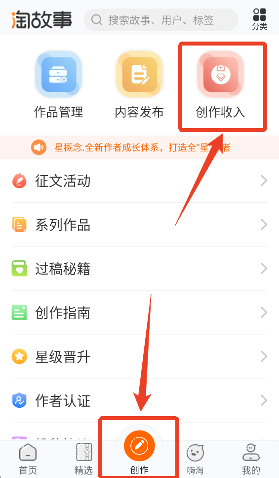 1、点击【创作】-【创作收入】。