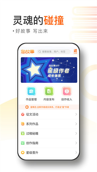 1、【热门故事分类】 民间传说,婚姻爱情 奇闻异事,科幻未来 悬疑推理,灵异志怪 青春校园,神话纪实 人生感悟,幽默笑话 2、【编辑精选】 还原那年的故事会,经典原创免费阅读 每天都有推荐好文,放松心情天天好看 3、【星级作者】 我们希望每一个读者也是作者,让每一个人都能创作,支持APP和网页端写故事,简单方便 文章有价,淘故事邀请你来写作,讲一讲你听过的故事,写一写你自己的灵感故事。 福利升级,征文多多,专属责编,贴心服务作者,聆听每一条意见建议。 4、【嗨淘畅聊】 以前的笔友,现在的嗨淘,随时随地交朋友,聊个话题吐个槽。无视距离,想说就说,你的感悟你的思想。淘故事怎么提现