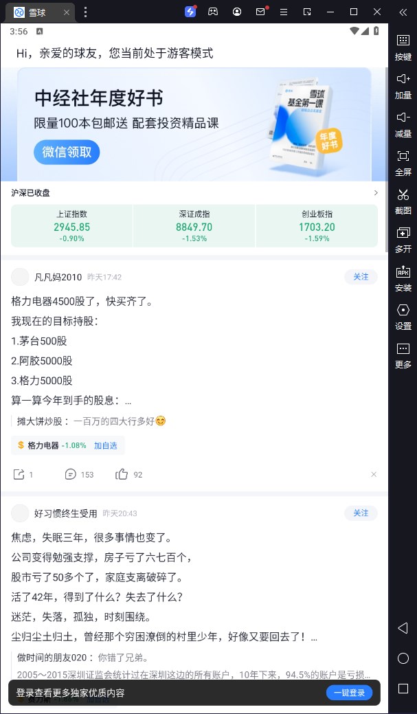 雪球股票电脑版是一款借助安卓模拟器而运行的集投资交流交易于一体的股票软件,该软件内置了全新的实时资讯信息和汇总了全网最新的、最热的市场行情动态,在这里用户们一站式阅读,一手了解整个金融市场行情走向。同时还支持在线开通股票账户、基金账户等,软件里炒股、投资理财低佣金,交易安全、方便、快捷。