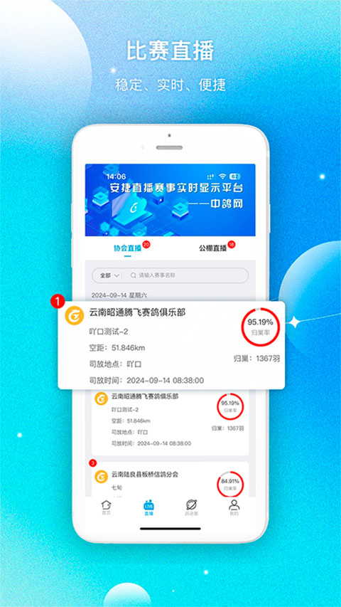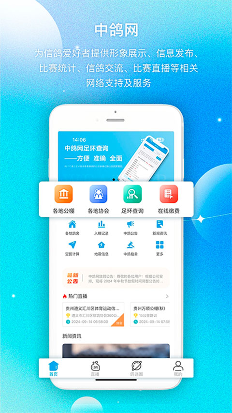 1、【直播】 打开手机APP,即可观看比赛直播,了解最近赛事动态。 2、【足环查询】 查询赛鸽信息,简洁方便,了解赛鸽历史比赛记录。 3、【收藏】 收藏您喜欢的协会公棚,即可快速查看直播信息及近期比赛。 4、【通知】 根据您的喜好通知最近比赛日程及比赛信息,避免您遗漏重要比赛。 5、【公棚赛鸽】 公棚赛鸽是一款中鸽网为公棚赛鸽拍摄照片的应用,一部手机即可记录赛鸽从入棚到获奖的成长,杜绝成鸽套环送交公棚。 6、【比赛监控】 比赛监控通过对司放鸽车定位跟踪、路线回放、发布照片及视频等,让鸽友能清晰了解整个司放过程,让信鸽比赛公开、透明、公正。 7、【鸽信通】 鸽信通群发短信,自动过滤重复号码,一次可提交最多一万个手机号码,送达率高达98%。 8、【足环查询】 查询赛鸽信息,简洁方便,了解赛鸽历史比赛记录。更新日志
