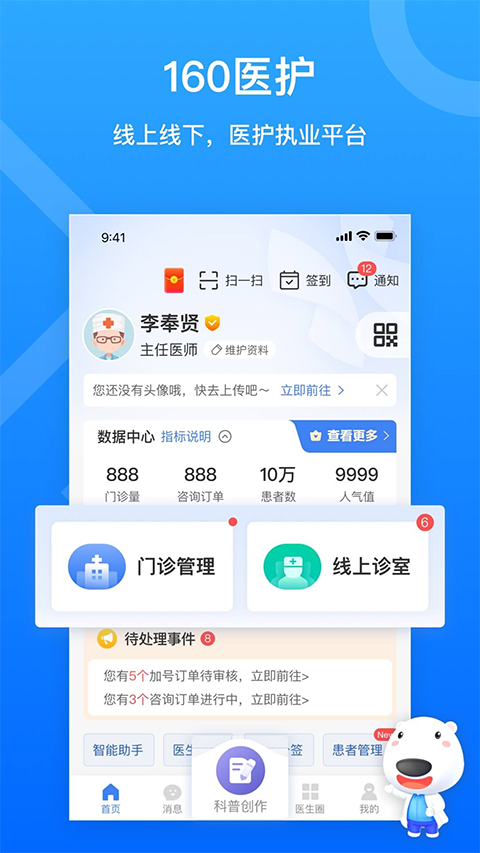 【医护执业平台】 为医护打造线上线下执业新方式,线上专属团队,线下多点执业,历史数据永久留存,执业便捷高效。 【预约管理】 医生可开放线上预约通道,实现多点自主排班,挂号加号双自由,为医生提供更加便捷的预约管理服务。 【移动诊室】 建立线上诊室,提供多样化的诊疗服务,助力医患高效沟通。聚焦私人医生,以专业工具,成就高效诊疗。 【医生短视频】 全民视频时代,千万流量汇聚,助力医生传递权威科普,赋能IP打造。 【电子处方】 医生线上“云”药房,药品齐全,配送到家,诊疗开方一键畅通。 【医患群】 医生专业定制版群聊工具,深度结合医生业务,实现精细化管理,助力医生打造私域流量。 【医生精选】 健康好物在线甄选,打造医生百宝箱,一键直推医患共赢,让诊疗有更多可能。软件特色