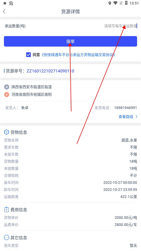 5、接下来用户输入承运数量点击接单即可接单成功。