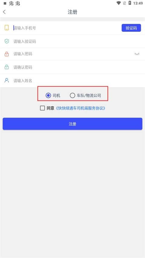 1、在本站下载安装并打开快快绿通车司机端app,进入软件进行注册登陆,用户可以选择自己的身份进行注册。
