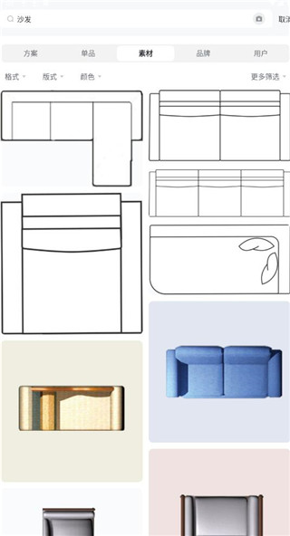 3、也可以搜索指定素材,比如小编这里搜了沙发,里面有很多沙发的设计图