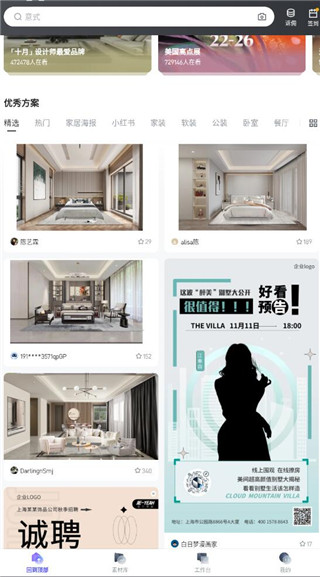 【寻找品牌单品】 - 通过名称、类型或者图片探索300余万件软装单品,以及上千家合作品牌,获得最新最全的产品信息。 【海量设计模板素材,一键再创作】 - 通过风格、场景找到优质的软装拼搭方案、提案PPT,学习参考优质方案的灵感。 - 「精美模板」家居营销海报、月签、日签、小红书封面模板、设计师人物、节气、简历、个人名片、语录,毕业设计作品、彩平图、多种风格软装搭配模板等100+场景。 【学习互动】 - 在美间探索发现喜欢的设计作品,对其他设计师的装修效果图库、小户型图库感兴趣的进行点赞。找到设计达人,关注他们,随时跟上设计潮流。美间app官方版使用教程