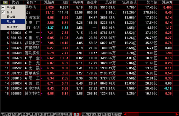 二、行情报表中支持股票集合的“统计”功能(点击最左上角的按钮)。