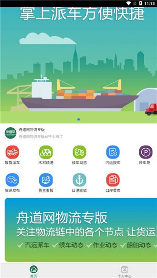 2、登陆后进入首页,为用户提供了散货派车,木材疏港,候车动态,汽车报车,货源发布等各种功能的快捷入口。