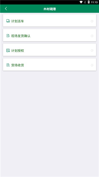 3、点击进入木材疏港,用户可以在这里进行计划派车,现场发货确认,计划授权,货场收货等操作。