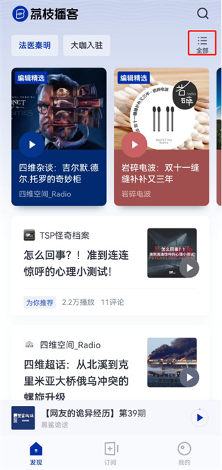 1、双击打开荔枝播客软件,点击软件右上方的全部;
