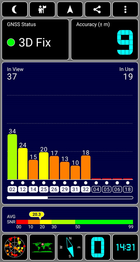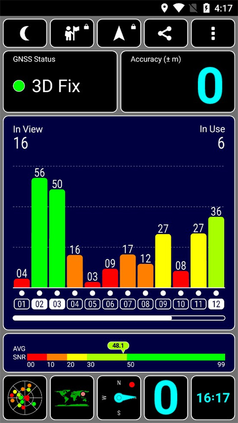1、线路追踪:时时追踪线路,计算路线长度。 2、测速仪:包含速度表、公里表、经纬度、海拔、超速告警。 3、指南针:利用磁阻传感器进行方向识别。 4、位置搜索:根据记录的坐标进行位置搜索,雷达扫描视图。 5、精准标记位置:记录当前gps坐标位置。GPS Test安卓版使用指南