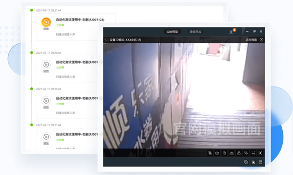 一、货物追溯 视频监控联动运单系统 将物流企业的运单系统与视频监控系统打通,实现从揽件、转运,到分拣,投递各环节的运单管理可视化 一键回溯视频录像 处理问题订单时,从繁琐的检索订单时间、定位地点、手动查找录像,提升为仅需输入单号,即可一键快速回溯相关的视频录像,也可对问题录像进行云备份,延长存储时间。大大提升追溯效率,保留追溯依据,优化服务体验