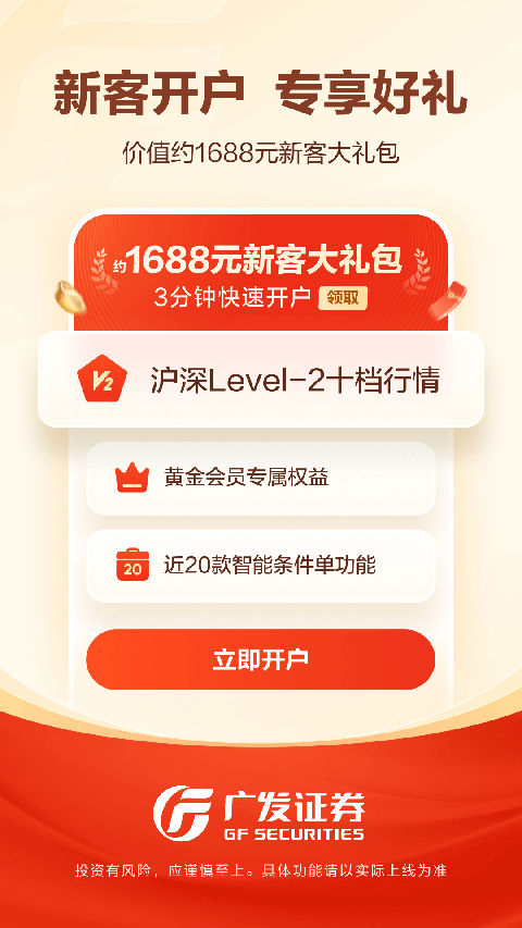 1、开户送大礼,开户即送Level-2,3分钟快速开户,单向视频不排队,沪深A股、基金账户一步到位; 2、深度资讯速递,新财富首席解读、投顾荐股、有声开讲,个性化订阅; 3、免费查看广发晨会、内参、广发核心研究资料等一手财经资讯,与机构用户同步共享; 4、查流水、查资产、查负债、查盈亏,资产分析,投资账单一览无余; 5、更便捷的股票软件,股票开户、股票入门,模拟炒股,炒股大赛、股民学院、股票行情、股票交易; 6、更深度的股市资讯,股票资讯、财经头条、金融圈、华尔街见闻、财联社、财新网、FT新闻应有尽有; 7、更权威的投顾服务,广发证券所有投顾高手均是证监会持牌投顾,专业靠谱;广发易淘金使用教程