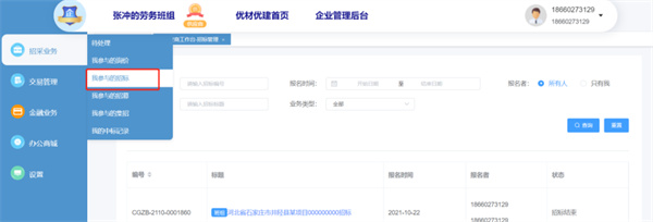 2、如采购商使用邀请方式发布招标,则审核通过后,只有被邀请的班组才能收到招标信息,被邀请的班组登录成功后,在【我报名的招标】中,可见邀请的招标;