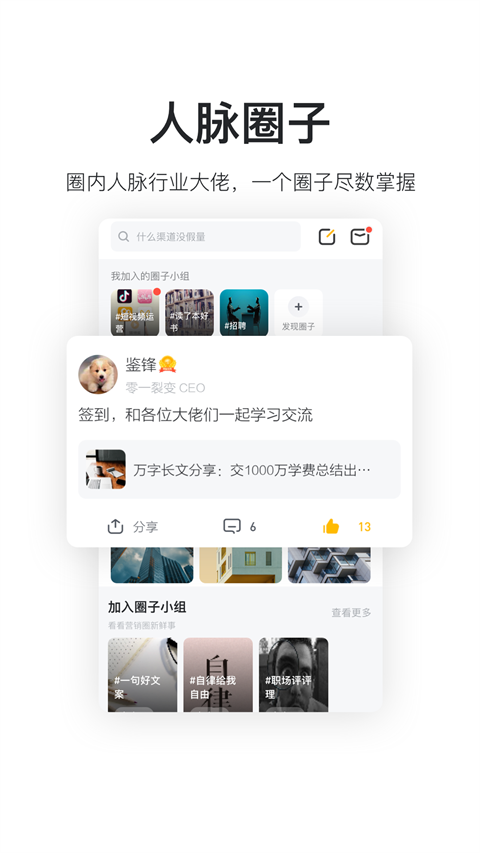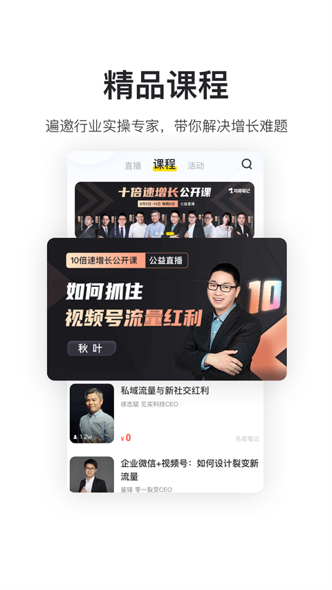 1、干货分享 每日推荐关于APP的推广,运营,营销,文案,产品等干货 2、鸟哥学院 汇聚一线大咖,专题讲解,解答疑惑。线上分享,提高技能,线下沙龙,聚拢人脉。 3、问吧 任何疑惑,发帖询问,立即得到大家的解答,操作简单直白。功能介绍