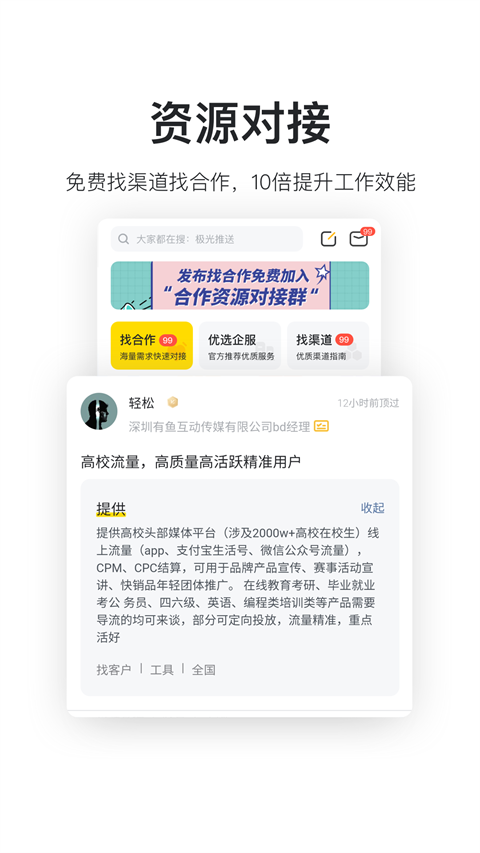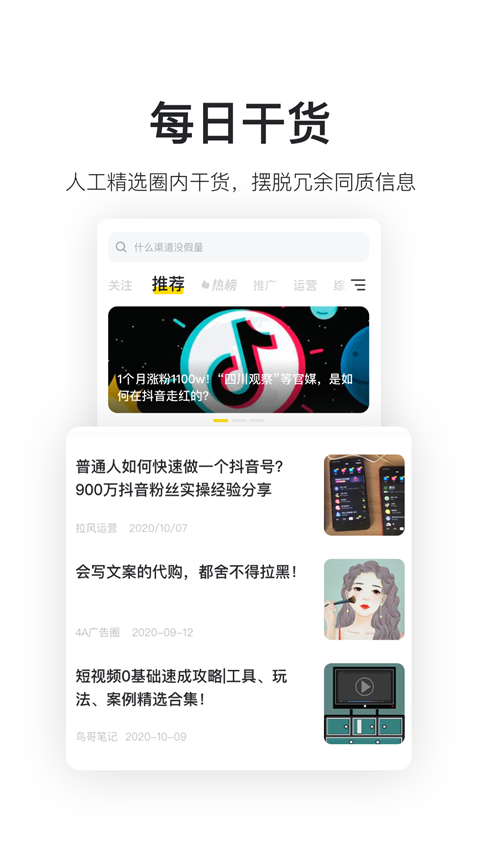 1、干货 每日人工精选圈内干货文章,涵盖用户增长、私域流量、APP推广、ASO、新媒体运营、用户运营、数据分析、活动运营、职场进阶,无论思维升级还是实战技能,这里一站打包。 2、快讯 追踪互联网行业前沿快讯,包含热点事件、创投资讯、大厂一线动态、新产品发布、科技新闻等,让你速览行业新动向。 3、学院 精选优质视频课程,APP营销推广、APP变现、抖音涨粉、用户运营、新媒体运营、活动运营全覆盖,遍邀行业实操专家亲自讲解,带你解决职场难题。 4、找合作 营销增长人的移动资源库,聚合各互联网企业BD市场人脉和资源力量,汇集海量合作需求信息,找合作,找渠道,找客户,就上鸟哥笔记。 5、圈子 营销增长人的线上社区,有趣有料,信息密度高,更高效地帮你拓展人脉、交流合作、求职招聘。更新日志