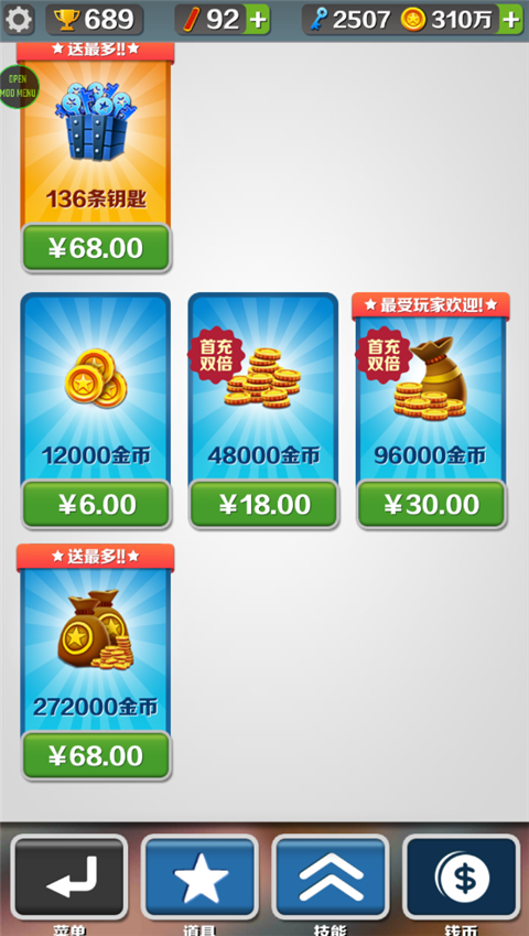 4、该版本的内置菜单是全中文版本,分别是解锁免费购物,一键解锁全角色、滑板、背饰的强大功能,点击相关功能右侧对应的按键即可开启