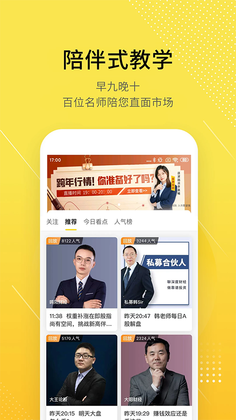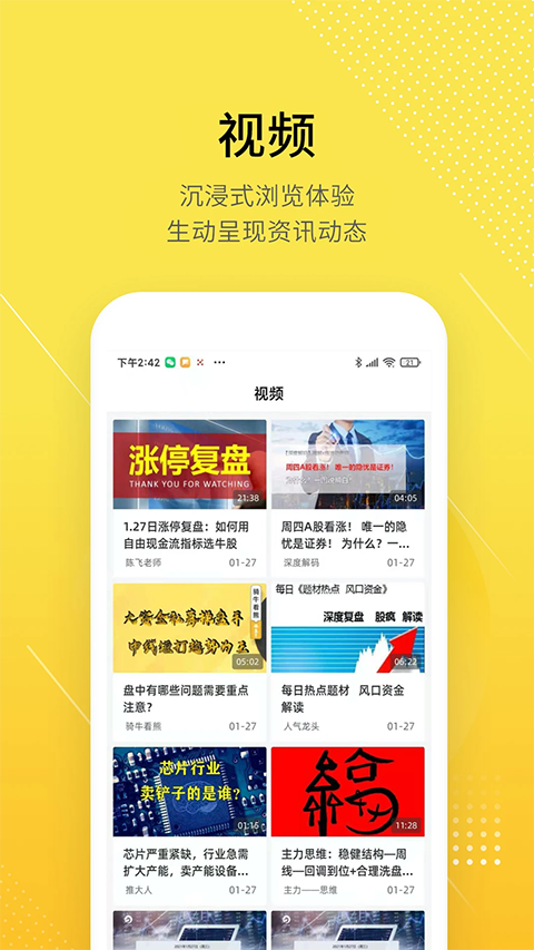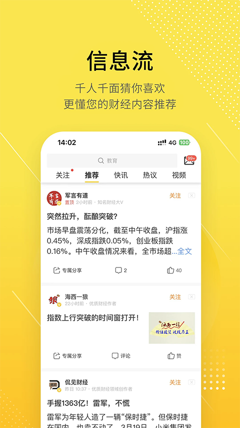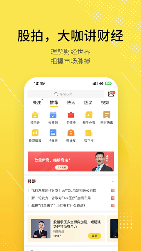 1、陪伴式教学——早九晚十陪您直面市场资讯,每个交易日在线直播教学,通过高效、生动且深入的教学方式,系统化地学习财经知识。根据最新的市场动态和政策变化,及时调整教学内容,确保用户学习最新、最实用的财经知识。 2、优质短视频——零距离交流丰富的财经短视频内容,专业与趣味合一,轻松了解最新的财经信息,为用户提供个性化的视频资讯推荐。优质财经短视频以对财经事件、市场趋势进行深入剖析和解读,帮助用户理解背后的逻辑和规律。 3、热点话题讨论——行业板块动态快人一步,围绕热点话题及时输出图文资讯,听大咖深度解读,与财友们多方位探讨。各方观点激烈碰撞,思维火花四溅,通过深入讨论和交流,让用户能更好地理解财经世界。软件功能