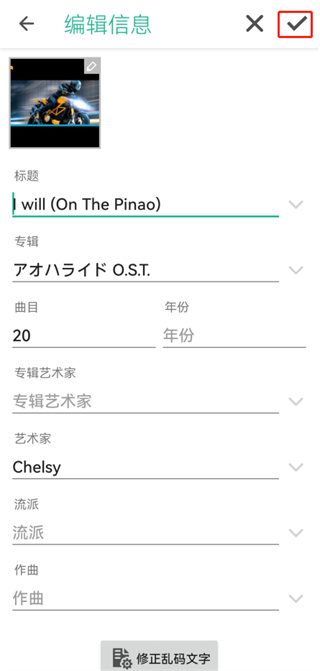 2、进入编辑信息界面后,点击音乐文件的专辑封面,在这个界面内修改要修改的文件信息;