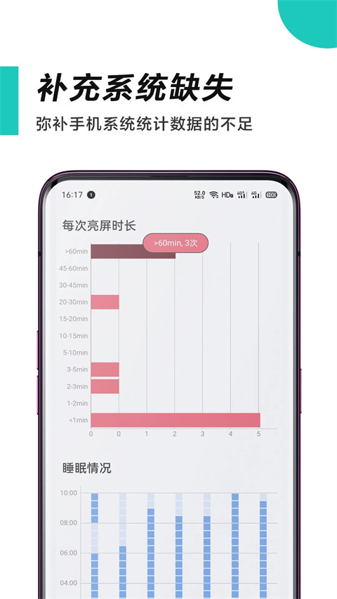1、呆呆的看:静止不动看手机的时间,大部分在室内坐着时候划手机的时间 2、边走边看:一边走路一边看手机的时间,注意来往行人车辆哦,别撞到柱子上了 3、第一次拿起:每天早上醒来第一次解锁手机的时间,根据当地日出的时间进行比较得出来的数据 4、最后一次放下:昨天最后一次锁屏的时间,基本上也是现代人睡觉的时间,如果你在后半夜睡觉,那么还会显示「凌晨」几点 5、睡眠时长:从今天最后一次放下手机到第二天第一次拿起手机的时间,可以说是反应现代人最真实的睡眠时长了软件特点