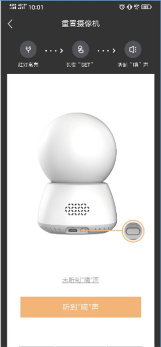 4、长按设备背面 set键,听到“滴”提示音点击“听到滴声”按钮。