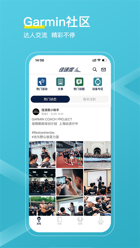 1、热门动态 和其他跑友分享彼此的冒险故事;全面分析活动的各种数据。 2、热门话题 多元的主题,专属分享讨论运动生活的大小事。 3、训练+ 不同程度和內容的单一训练课表,免加入训练营和课程,一次次的训练,适合忙碌的你。 4、每日课程 从减重轻运动至专业马拉松,针对多种不同需求的训练课程。 下载每日课程至手表,训练完毕后自动上传。有伴一起练,进步看得见!佳速度app使用教程