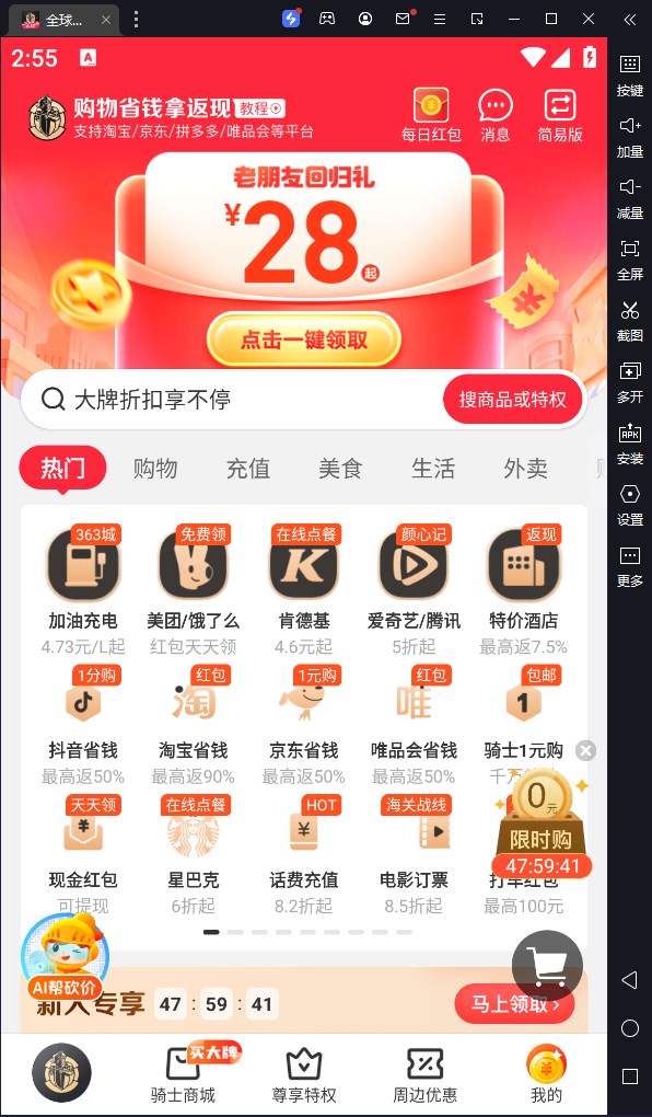 全球购骑士特权电脑版是需要借助模拟器在电脑上运行的一款线上商城优惠购物软件。软件整合了国内外丰富多样的优质购物特权,为用户提供了真正有价值的购物优惠券和特权体验,让用户可以轻松浏览各大品牌、商家的最新优惠活动和独家特权福利,享受优惠购物体验。