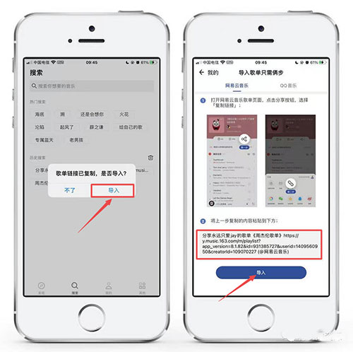 2、把链接复制后,回到【发条】应用,app会自动识别到链接中的歌单,按提示,点击【导入】即可同步;