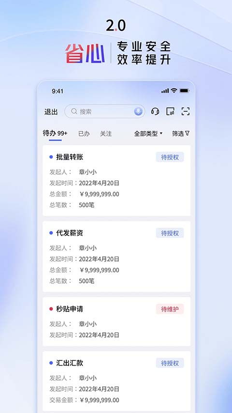 1、【查询更直观】 新增“我的”板块,更快速查询自己账户余额、明细、投资理财等信息。 2、【支付更方便】 支持多种支付方式,无需刷卡带现金,让您轻松付账。 3、【转账更便捷】 转账大瘦身,无需您逐一筛选,系统自动识别,让转账变得更简单,操作更便捷。 4、【理财更高效】 产品丰富多样,投您所好,让您轻松找、任意选!交通银行企业手机银行新手指南
