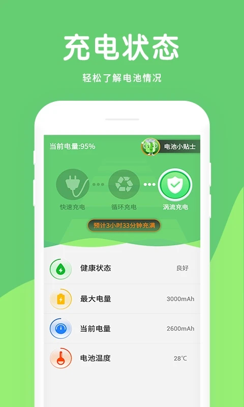 1、一键查看电池的损耗状态显示可用时长; 2、清理无用后台延长电池续航; 3、多种省电模式,轻松节省电量; 4、安全的充电保养,有效保养电池。软件亮点
